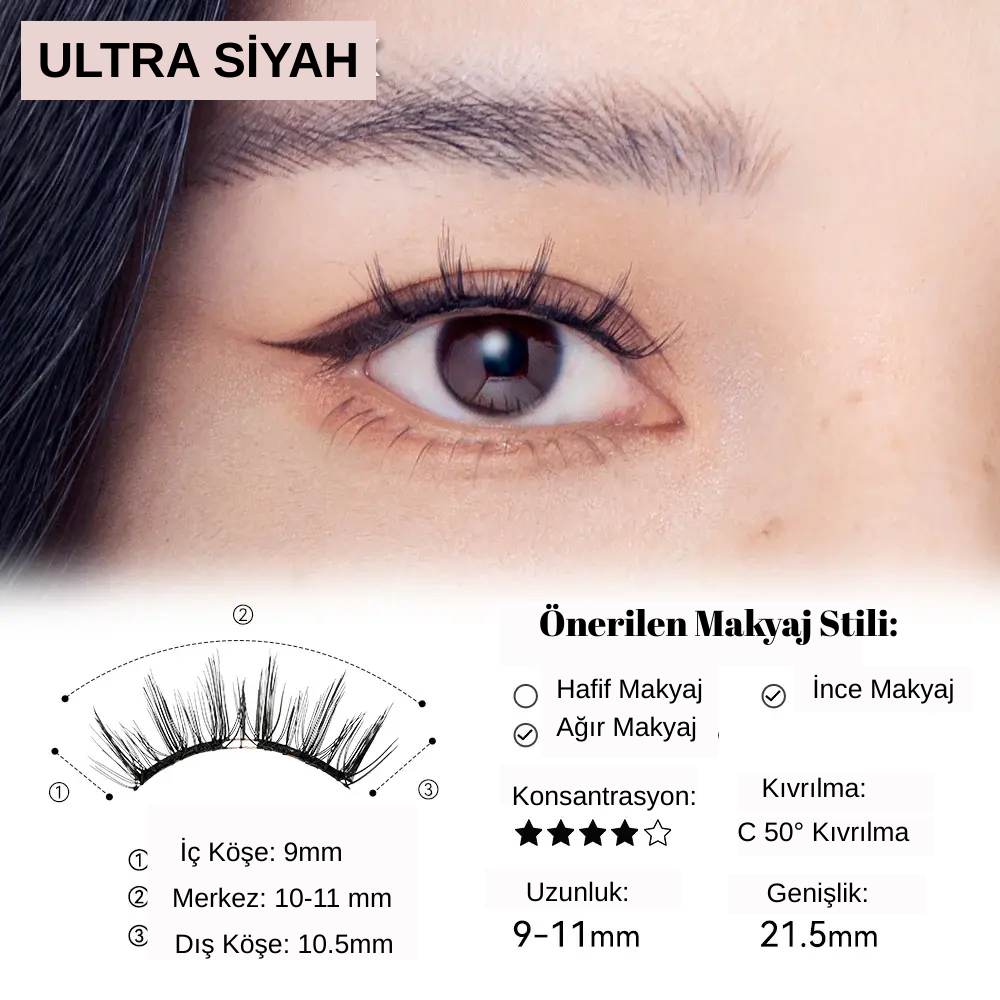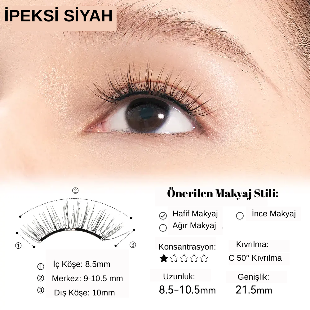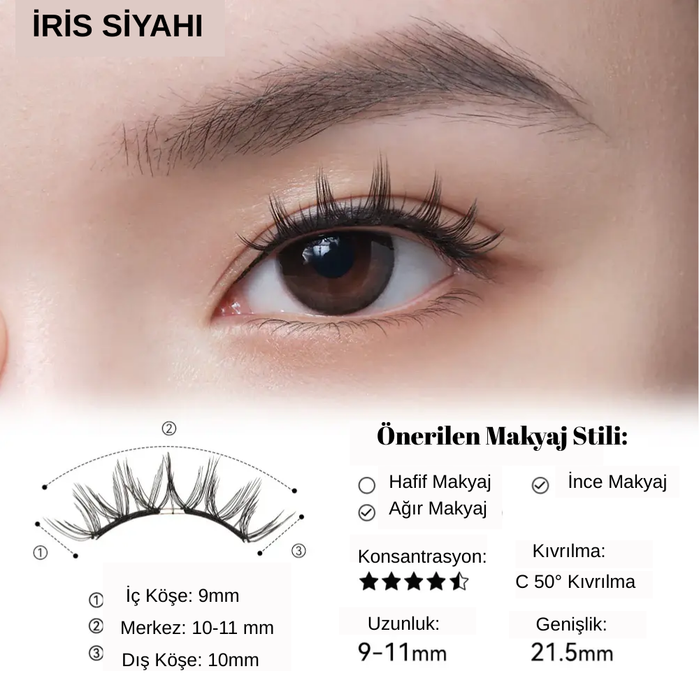 Her göz için iki manyetik kirpik parçası bulunur. Bu parçalar, doğal kirpiklerinizin üstüne ve altına yerleşerek birbirine “klik” şeklinde tutunur. Yapıştırıcı yok, uğraş yok!